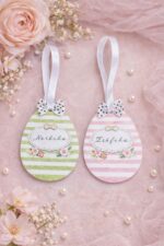 A pasztell színű tojás alakú díszeken egyedi név szerepel, így minden darab személyes és különleges ajándékká válik. A dekoráció akasztóval készül, így könnyedén felakasztható: