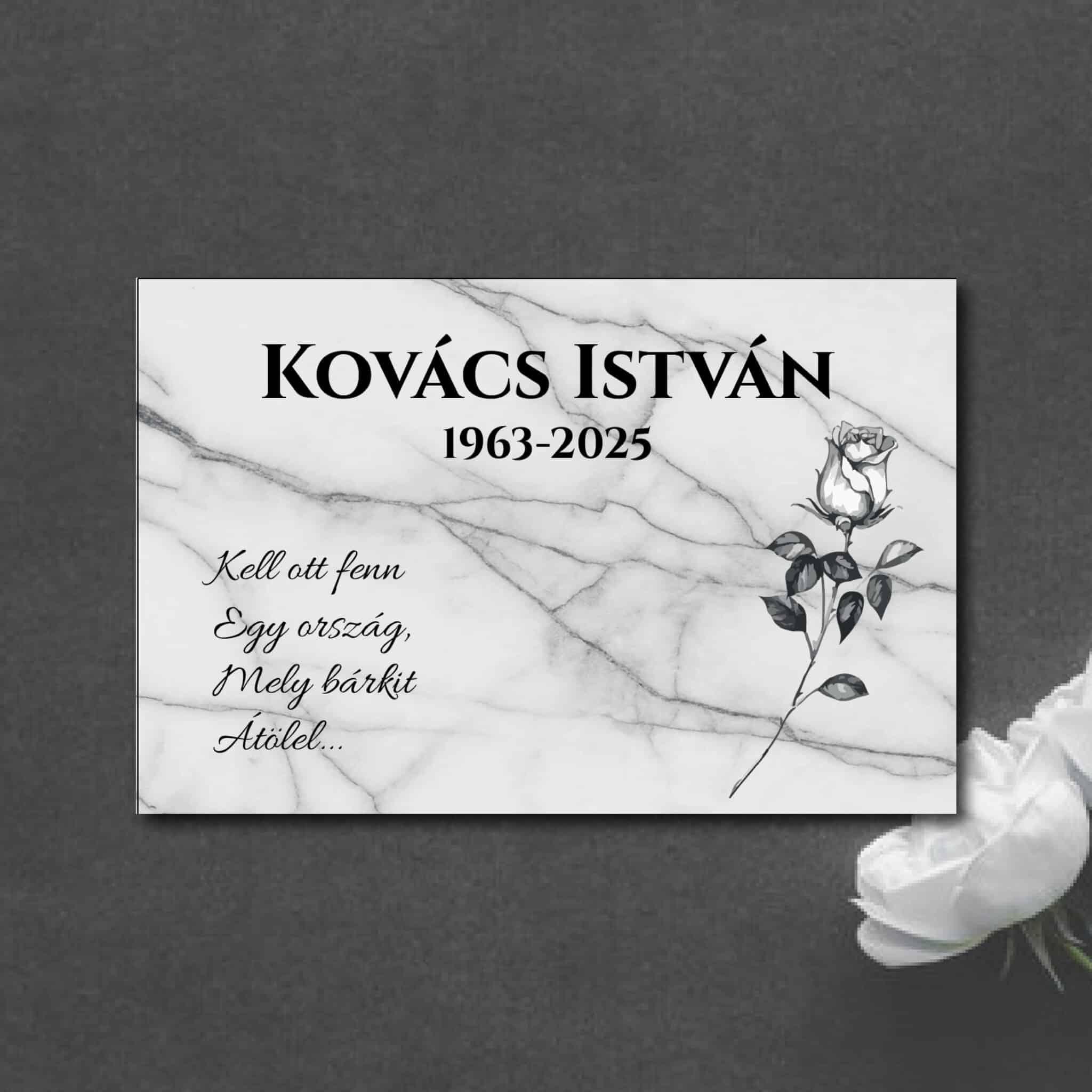 A világos márvány mintás felület méltóságot és harmóniát sugároz, így különösen alkalmas arra, hogy méltó dísze legyen a síremléknek. A tartósság mellett a vizuális hatás is fontos: a márványhatás klasszikus, időtlen szépséget ad az emléktáblának.